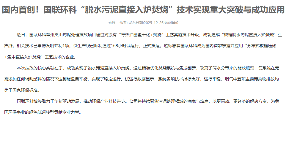 公司成立以來(lái),積極探索符合國家政策、適合國情的高效實(shí)用污泥處置工藝路線(xiàn),從技術(shù)選型、項目投資、建設和運營(yíng)等方面,因地制宜為客戶(hù)提 供全方位的污泥處理處置一體化解決方案。目前公司在調質(zhì)深度脫水、資源化焚燒、資源化利用等方面擁有多項核心技術(shù),已形成“污泥調質(zhì)深度 脫水+干化+自持焚燒”、“污泥干化+耦合焚燒發(fā)電”和“污泥堿熱水解蛋白提取+資源化利用”三大成熟的技術(shù)路線(xiàn),其污泥處理處置的減量化、無(wú)害化、資源化利用效果處于國內污泥處理處置技術(shù)的領(lǐng)先水平。公司在江蘇、上海、山西、廣西、四川等省市,已建成了多個(gè)污泥處理處置項目,運營(yíng)穩定,得到了生態(tài)環(huán)境部、住建部等相關(guān)部門(mén)的充分肯定,并以減量效果徹底 ...